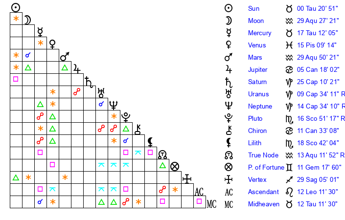 | Saturn | 25 Capricorn 12 | 26 Pisces 40 | 25 Capricorn 2 |