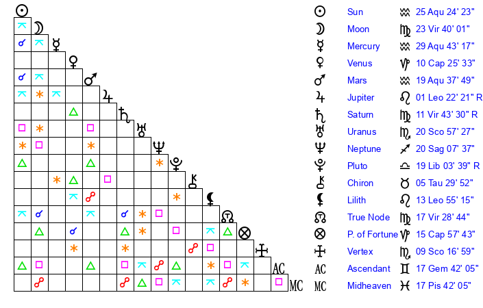 | Saturn | 12 Virgo 9 | 18 Pisces 54 | 8 Virgo 42 |