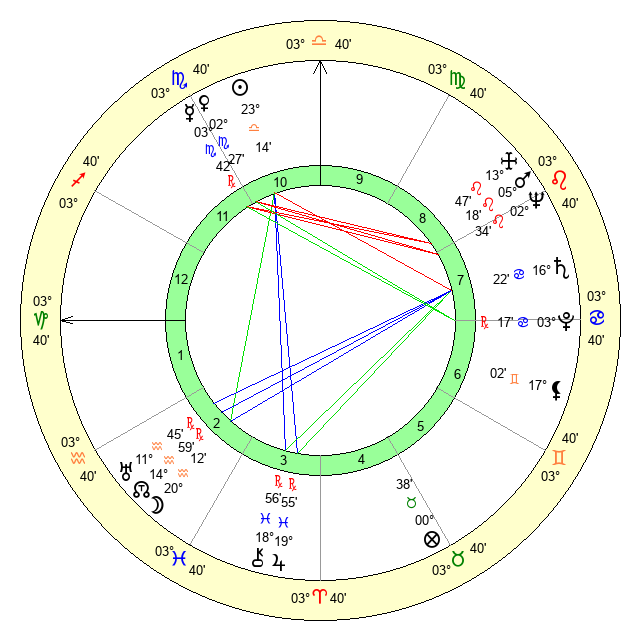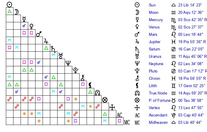 | Moon | 20 Aquarius 10 | 11 Virgo 53 | 28 Aquarius 39 |