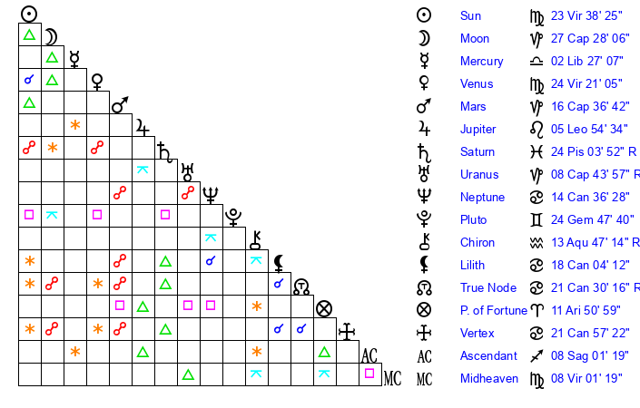 | Sun | 23 Virgo 38 | 25 Virgo 3 | 22 Capricorn 8 |