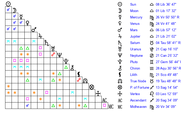 | Venus | 24 Virgo 42 | 16 Virgo 10 | 19 Aquarius 0 |