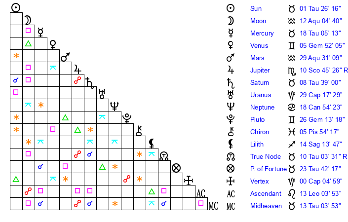 | Saturn | 9 Taurus 11 | 26 Pisces 53 | 20 Taurus 29 |