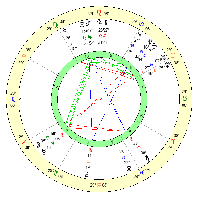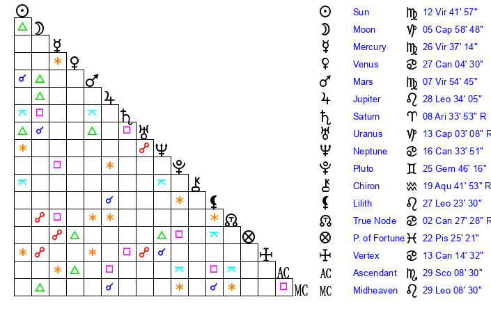 | Mercury | 26 Virgo 38 | 6 Virgo 5 | 14 Capricorn 5 |