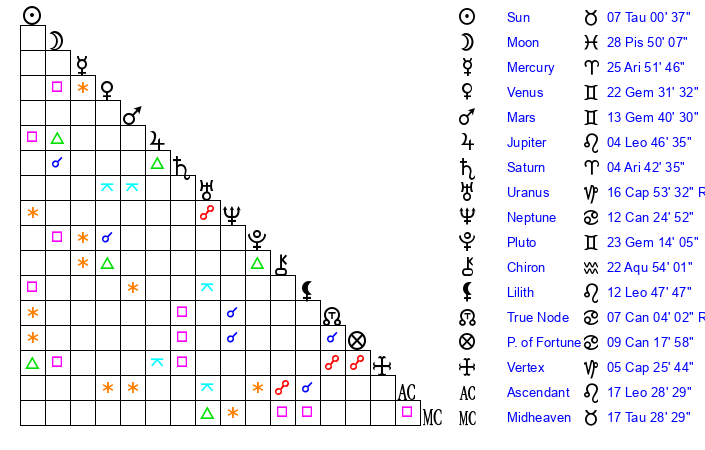 | Sun | 7 Taurus 1 | 7 Taurus 41 | 29 Leo 10 |