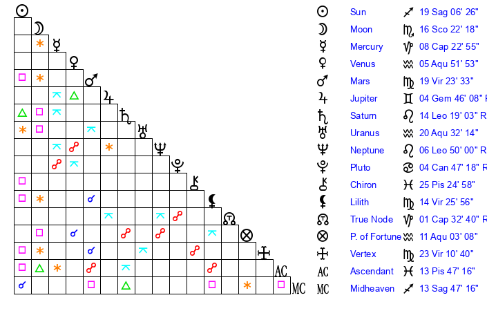 | Moon | 16 Scorpio 22 | 0 Taurus 49 | 18 Libra 48 |
