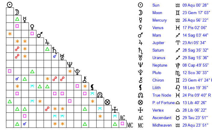 | Moon | 23 Gemini 14 | 12 Aquarius 20 | 20 Libra 0 |