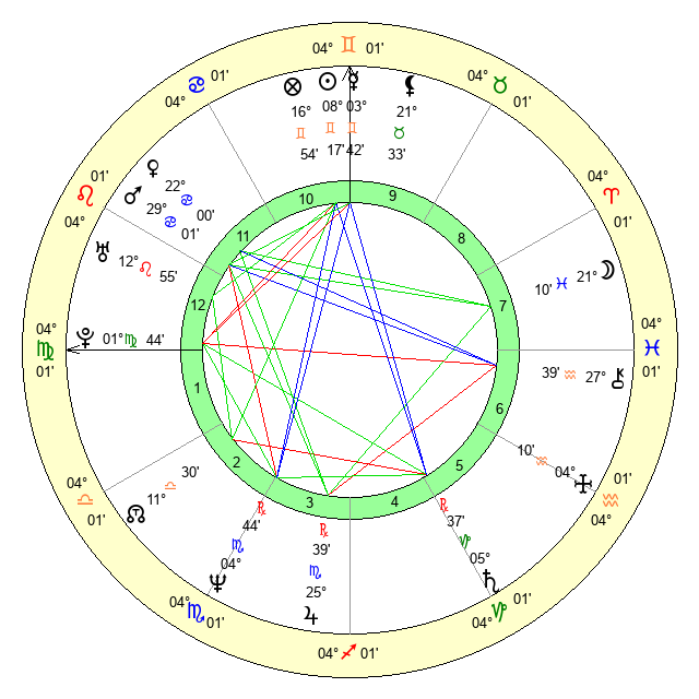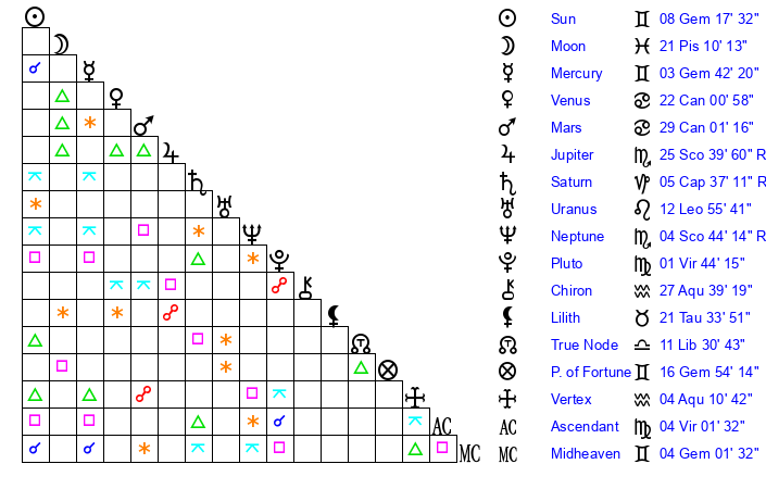 | Moon | 21 Pisces 13 | 24 Cancer 44 | 9 Leo 38 |