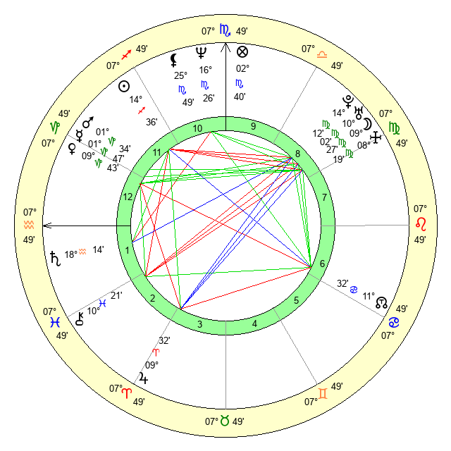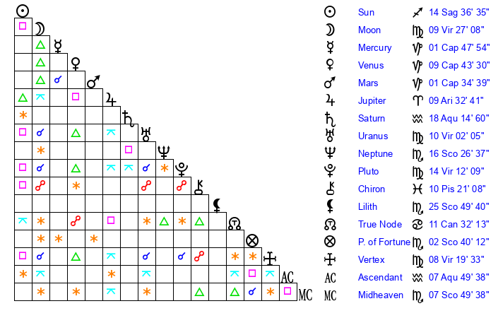 | Moon | 9 Virgo 27 | 0 Pisces 40 | 26 Scorpio 43 |