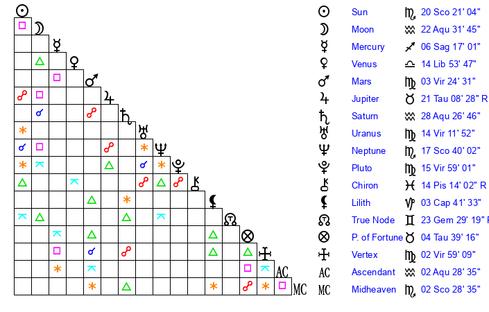 | Neptune | 17 Scorpio 40 | 29 Pisces 34 | 19 Scorpio 35 |