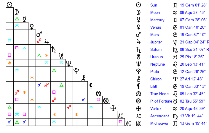 Pluto | 12 Cancer 27 | 3 Aquarius 30 | 14 Cancer 36 |