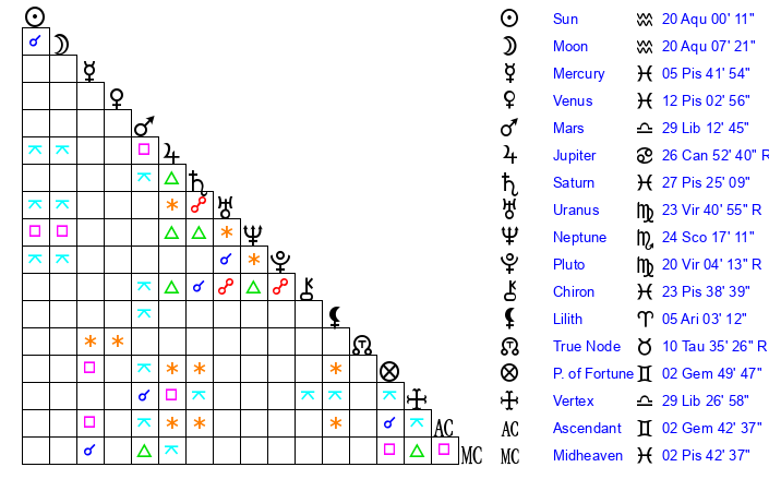 Mercury | 5 Pisces 42 | 20 Aquarius 55 | 21 Pisces 27 |