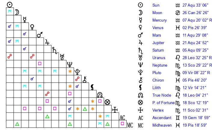 | Saturn | 5 Aquarius 25 | 19 Pisces 8 | 10 Aquarius 53 |