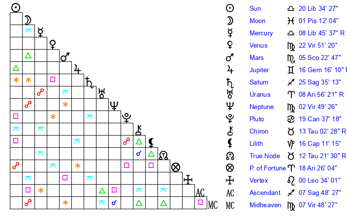 | Moon | 1 Pisces 13 | 29 Cancer 29 | 16 Virgo 23 |