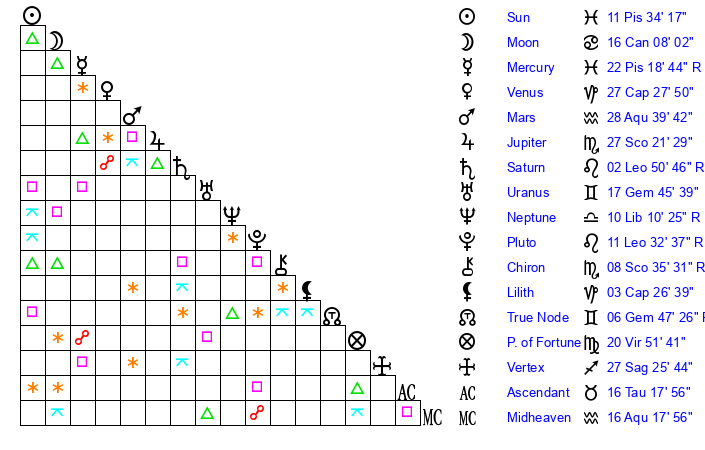 | Moon | 16 Cancer 22 | 23 Aries 24 | 20 Taurus 20 |