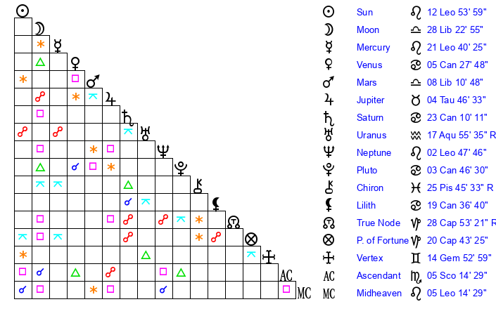 | Neptune | 2 Leo 48 | 1 Aries 54 | 4 Leo 50 |