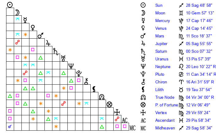 Sun | 28 Sagittarius 49 | 0 Capricorn 20 | 10 Aries 42 |