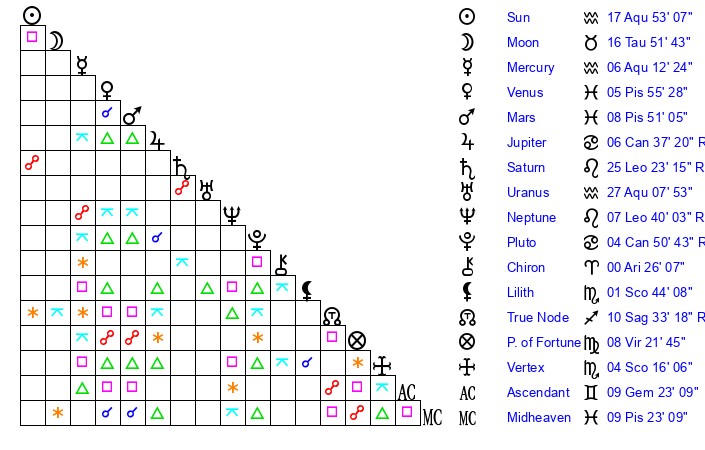 Moon | 16 Taurus 54 | 19 Gemini 48 | 25 Pisces 19 |