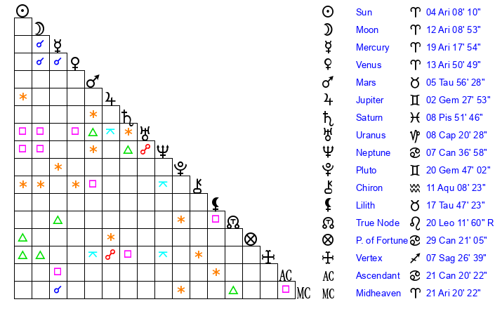 | Moon | 12 Aries 2 | 14 Aquarius 24 | 12 Leo 43 |