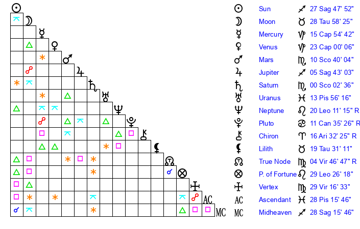 Moon | 28 Taurus 58 | 4 Virgo 51 | 15 Aquarius 39 |