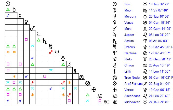 | Sun | 19 Taurus 36 | 20 Taurus 17 | 11 Virgo 44 |