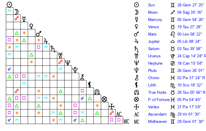 | Pluto | 26 Gemini 26 | 3 Aquarius 20 | 27 Gemini 54 |