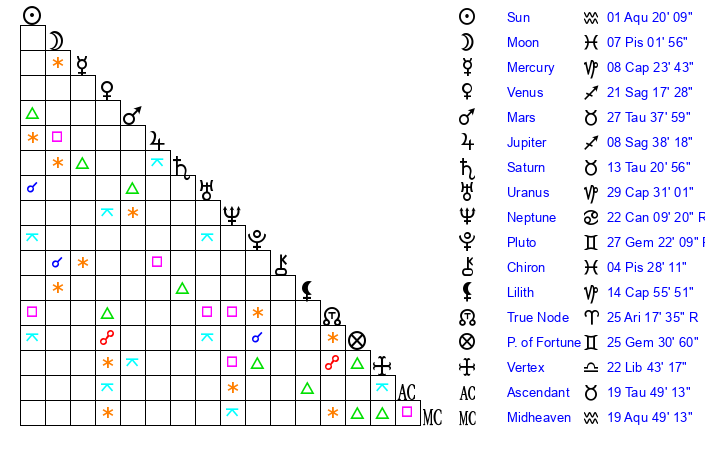 | Sun | 1 Aquarius 20 | 2 Aquarius 56 | 23 Taurus 30 |