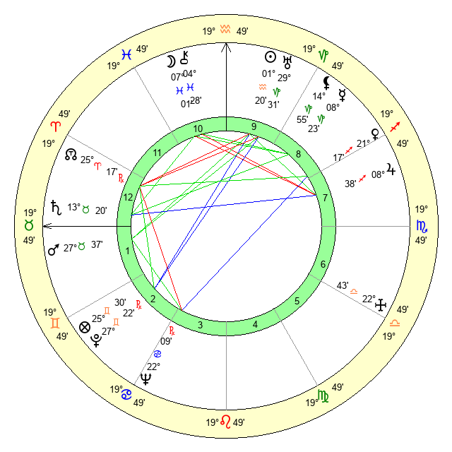 | Moon | 7 Pisces 7 | 12 Scorpio 2 | 24 Aries 52 |