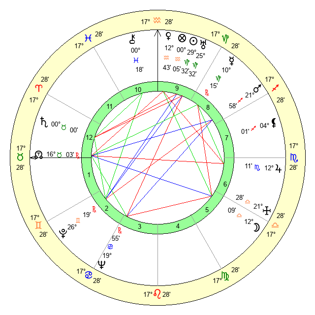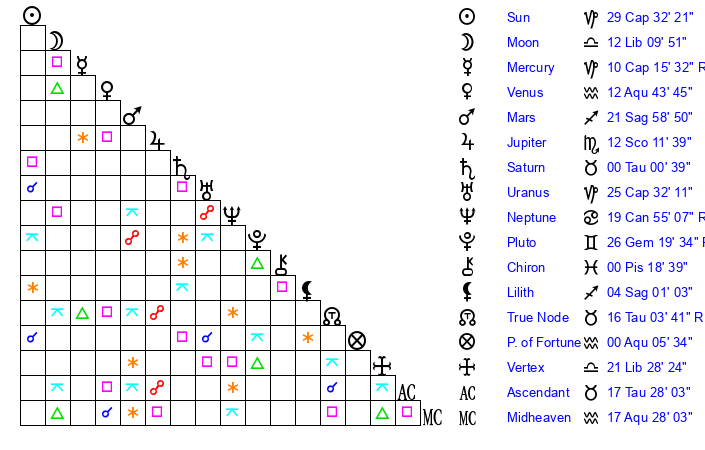 | Sun | 29 Capricorn 32 | 0 Aquarius 53 | 22 Taurus 46 |