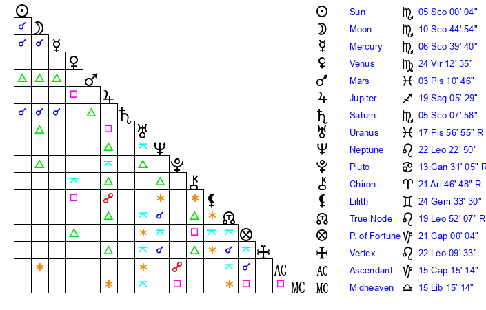 Sun | 5 Scorpio 0 | 5 Scorpio 46 | 16 Aquarius 24 |