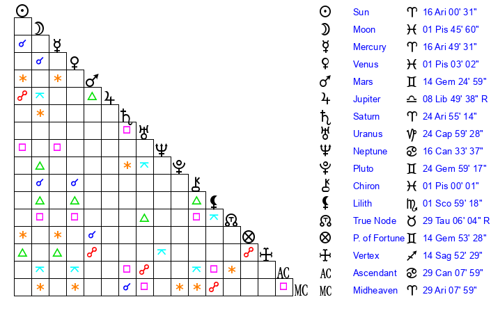 | Sun | 16 Aries 1 | 17 Aries 8 | 6 Leo 37 |