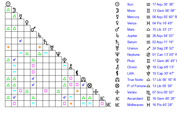 | Pluto | 17 Gemini 47 | 2 Aquarius 15 | 19 Gemini 9 |