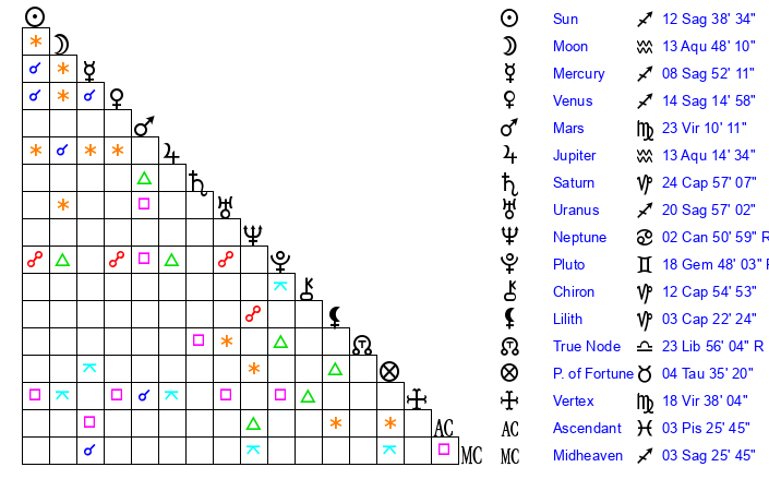 | Uranus | 20 Sagittarius 54 | 24 Taurus 30 | 25 Sagittarius 34 |