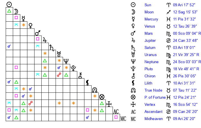| Moon | 12 Sagittarius 13 | 27 Aries 55 | 26 Capricorn 20 |