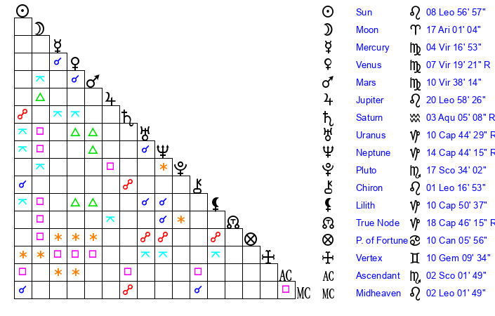 | Moon | 16 Aries 54 | 11 Scorpio 41 | 20 Cancer 43 |