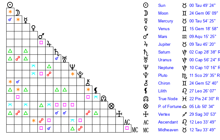 | Sun | 0 Taurus 49 | 0 Taurus 52 | 6 Gemini 36 |