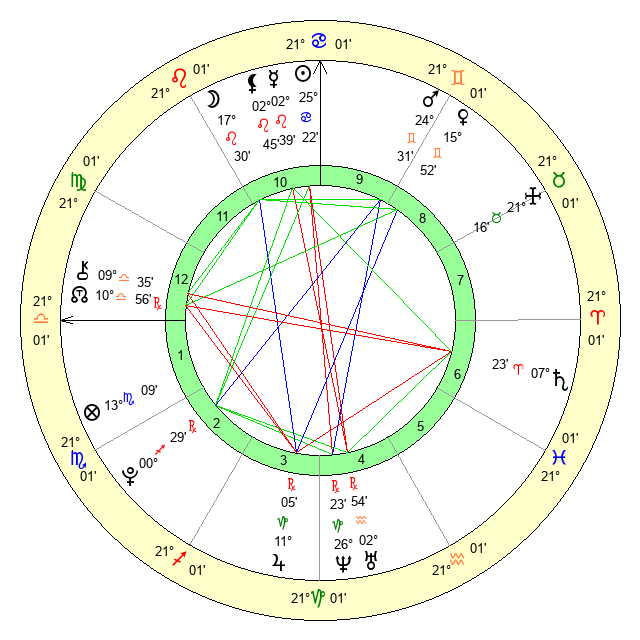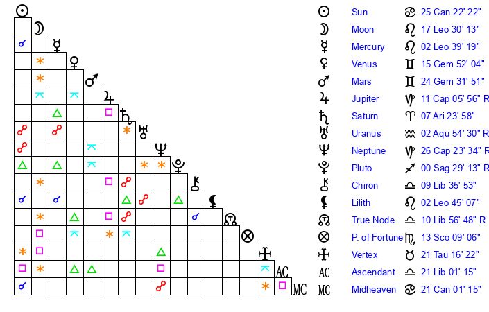 | Moon | 17 Leo 33 | 21 Aries 6 | 8 Virgo 31 |