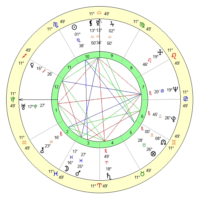 | Sun | 1 Scorpio 39 | 2 Scorpio 32 | 29 Aquarius 11 |