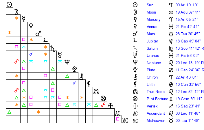 Sun | 0 Aries 19 | 1 Aries 5 | 7 Cancer 10 |