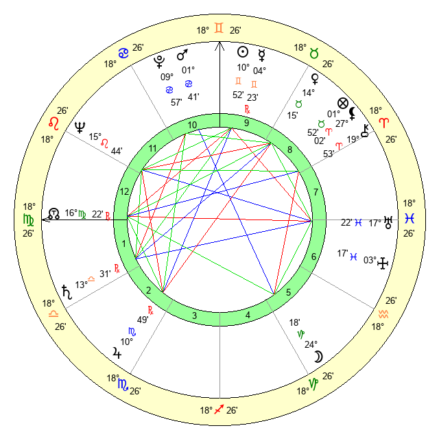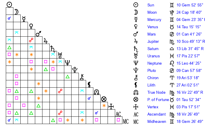 Sun | 10 Gemini 53 | 12 Gemini 10 | 18 Virgo 39 |