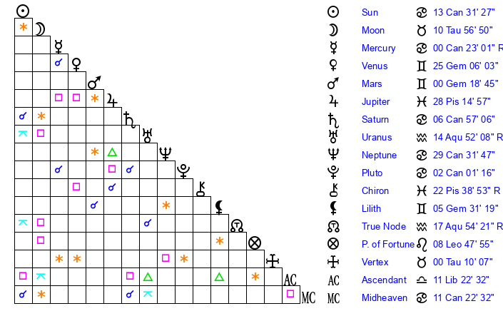| Neptune | 29 Cancer 32 | 2 Aries 10 | 2 Leo 38 |