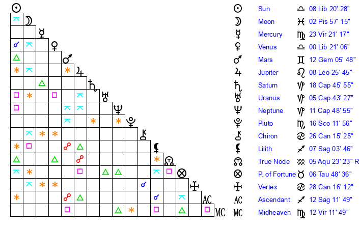 Mercury | 23 Virgo 21 | 22 Libra 26 | 22 Scorpio 0 |