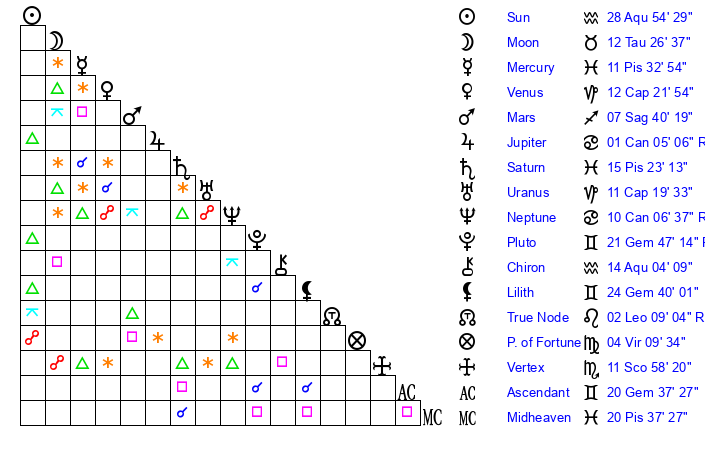 | Sun | 28 Aquarius 55 | 0 Pisces 17 | 24 Gemini 23 |