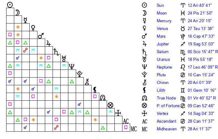 Moon | 24 Pisces 13 | 12 Gemini 27 | 27 Scorpio 14 |