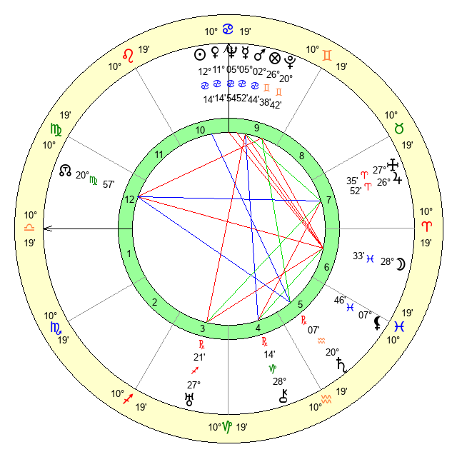 | Sun | 12 Cancer 14 | 12 Cancer 58 | 9 Scorpio 51 |