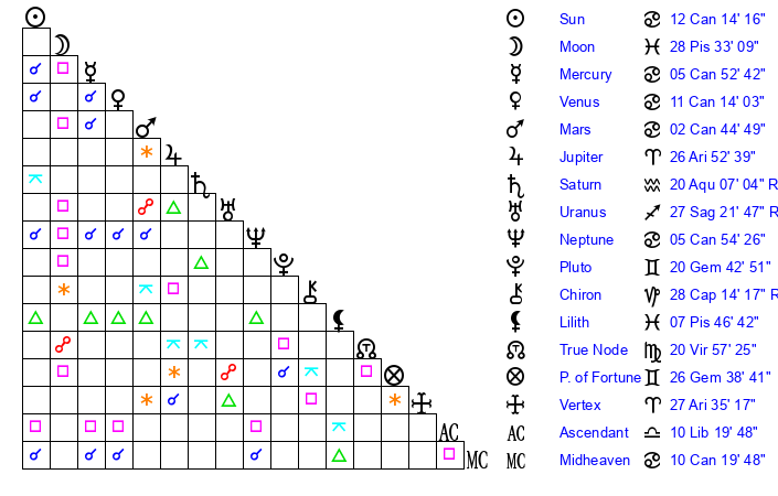 | Sun | 12 Cancer 14 | 12 Cancer 58 | 9 Scorpio 51 |