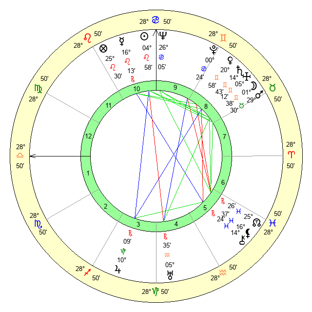 | Moon | 1 Gemini 28 | 23 Virgo 28 | 9 Cancer 8 |