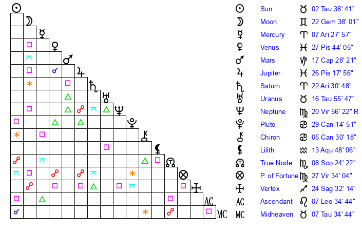 | Moon | 22 Gemini 44 | 6 Pisces 54 | 21 Leo 4 |