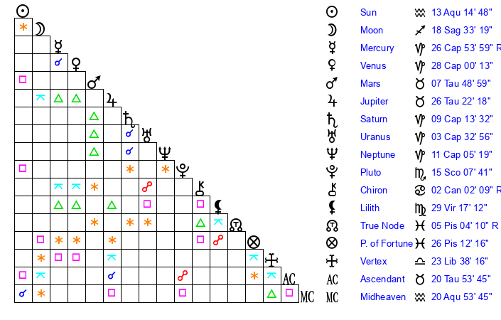 | Mercury | 26 Capricorn 53 | 8 Aquarius 16 | 29 Aquarius 2 |