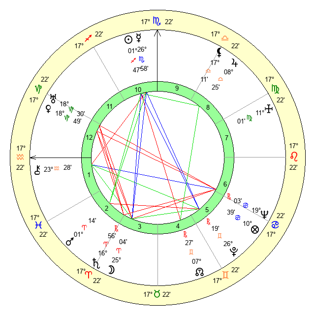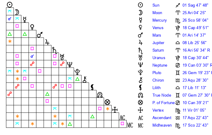 | Moon | 25 Aries 13 | 21 Virgo 2 | 17 Cancer 32 |