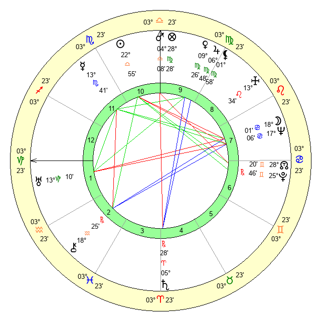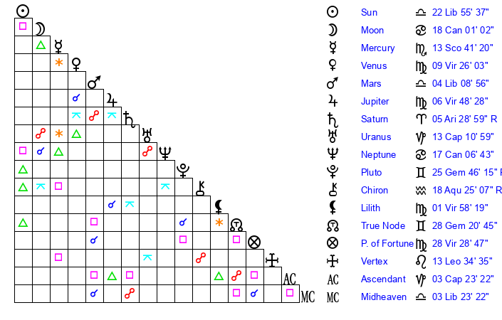 | Sun | 22 Libra 56 | 23 Libra 35 | 21 Aquarius 21 |